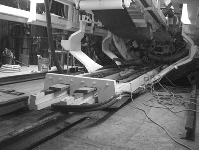 TSJV’s design specifications called for a 750 ft horizontal and 1,500 ft vertical curve capability. Clearance both inside and outside of the feeder suspension system had to accommodate these relatively sharp curves as well as the PVC flap on the segment. To provide the maximum clearance for the extended segment with the erector pickup head, the feeder was suspended on four hydraulic cylinders. These lifted the feeder off of the lining for the push but lowered it again prior to feeder extension. This design prevented the suspension system from being damaged in the event that the erector pickup was accidentally extended instead of retracted when picking up the segments (see Figures 7–8).