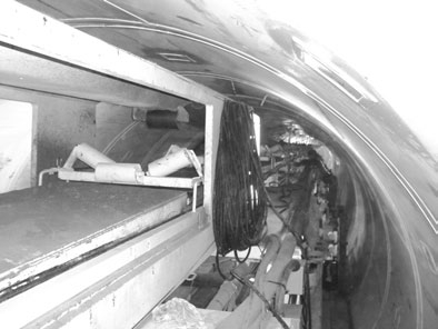 Fire hazards were also of concern and therefore all consumables (greases and oils) used were fire resistant. Also, the conveyor system booster drives were outfitted with temperature sensors. The conveyor system was outfitted with many sensors which were tied into the global PLC control and monitoring network. These sensors included slip sensors, heat sensors, drive amp monitoring, etc. These sensors transmitted the status to the PLC network many times per second. Traylor Shea implemented many alarms monitored on the TBM operator and office monitoring screens in case any of the sensor readings approached levels that required corrective action. All of the sensors were tied to an automatic shut down in case dangerous levels or hazards were indicated.