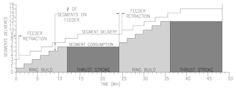 The time study, shown in Figure 6, was used to determine the speed and capacity parameters for the segment lifters, hoist and feeder. The cycle time was designed to allow both the advance of the TBM and erection of the 6-piece segmental liner in an approximately 30 minute timeframe, which was composed of 15 minutes of ring building and 15 minutes of mining. This cycle resulted in a segment feeder capacity of three segments. To ensure an uninterrupted supply of segments, four sets of segment lifters were included in the backup design to collectively handle 2 complete rings. Because the feeder was much closer to the TBM, most of the feeder load was transferred there. The towing frame of the TBM had to be heavily reinforced to accept this load. This setup was difficult because there was only so much clear space inside the erector and most of this was taken up by the screw conveyor and the many hoses and cables. One consequence of the design was that access into the shield was more limited than it would have otherwise been.