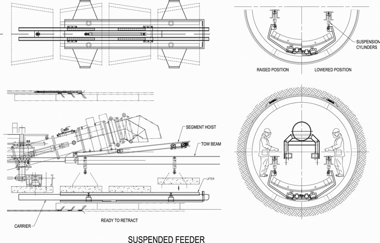 Ordinarily, segment feeders run on wheels. Feeders need to be low profile enough so that they can insert the segment below the erector pickup. This limits the possible diameter of the wheels. Given the small diameter and low contact pressure allowed for the wheels, many wheels would have been required. Ensuring that all of these wheels would have equal loading, especially in a tight curve, seemed impractical so the decision was made to suspend the feeder from beams running between the TBM and backup. These beams also served to tow the backup and support walkways along the feeder leading to the TBM.