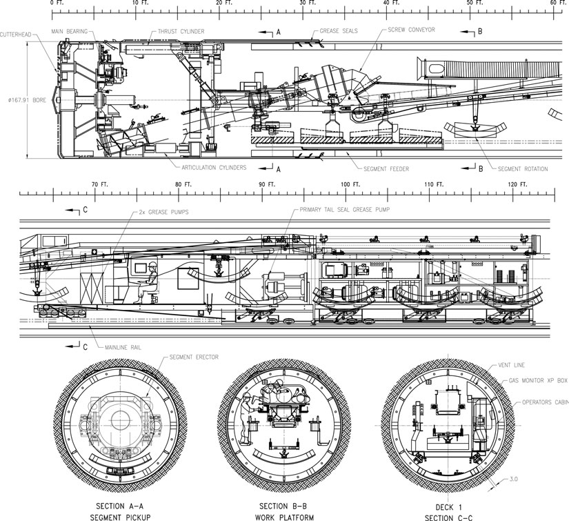 To minimize roll-back of liquefied spoil, the incline of the belt was limited to 6°. At this angle, to reach the elevation of the main run of the conveyor, the bridge needed to be 56 ft long. Given the compressed startup length, this put the rear support point of the bridge near the rear end of deck 1 and caused the bridge to run right through the deck. This meant that the movement of the bridge, due to curves, that normally occurs out in front of deck 1 now had to be accommodated within it. Due to the severity of the curve requirement, the amount of this movement was greater than normal. This movement meant that upper portion of the structure had to be open at the forward end to clear the bridge. The segment hoist, being an integral part of the bridge, also experienced significant lateral movement in a curve. Therefore, the structure had to be contoured to clear the already wide segment when carried along an offset path.