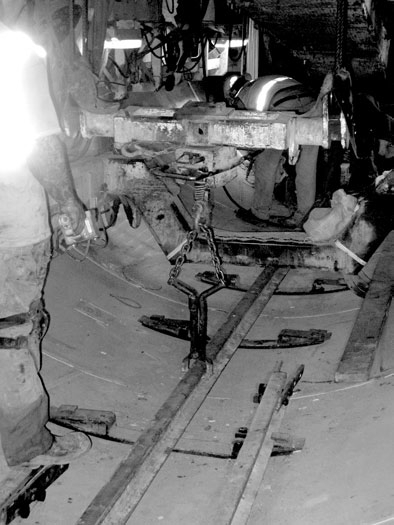 The front half of the deck structure was another component of the load but this was already minimal due to the open bottom and top at the forward end. There was very little equipment mounted on the deck and therefore no ballast required either. Only two small grease pumps and the operator cab occupied most of the deck length, and they were not very heavy. The larger tail seal grease pump was located at the rear of the deck but sat directly over the rear wheels so it did not contribute to the front wheel load. Only one set of segment lifters was located on this deck at the rear, so only one segment car would reach that location. It carried 3 segments and weighed 7.5 tons. The car and the lifting mechanisms were located just ahead of the rear wheels and so didn’t contribute significantly to the front wheel load.