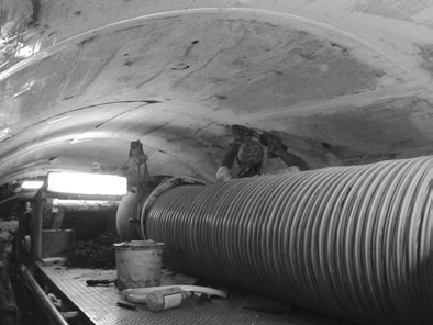The last work area in the process allowed welding of the PVC joints at the approximate springline locations of the tunnel on both sides. Conveniently, the two backup decks designed for installation of the mainline conveyor gear provided adequate access to both springline locations for PVC welding. Adequate lighting and power takeoffs completed the preparations to allow welding in this location.