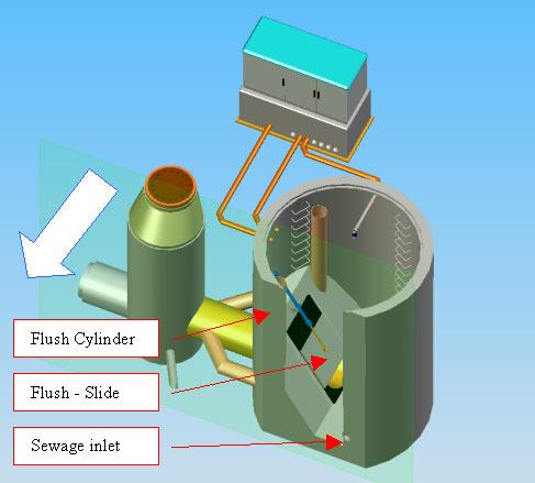 - Time based activation of the sewer flush technology with PF Pump-Flush-Cylinders, by sewage water or salty ground water, which causes no problems in the in the biological clearing process of the sewage treatment plant.