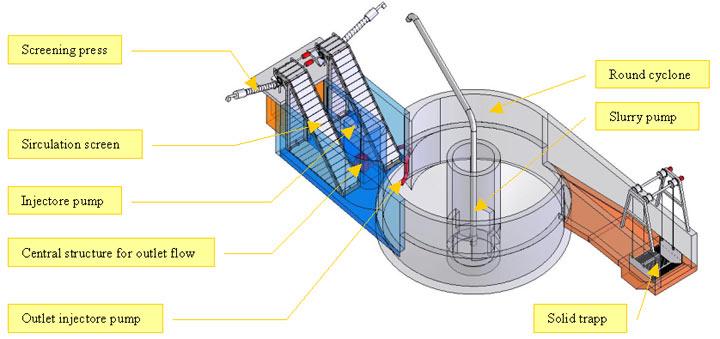 The round cyclone is an innovative new development and the task is to destroy the high-energy flushing by the forced radial flow in the round cyclone in front of the sewage treatment plant or a following pumping station. Together with an upstream rotating material screen it can achieve a significant removal of sand grit and waste matter solids. A great benefit is that downstream connected wastewater pumps cannot be damaged by sediments carried forward. The 3D sketch in Pic. 10 shows the special equipment in the structure of a round cyclone, which has to be installed for an optimized activation and treatment of flushing waves. The necessary diameter for the round cyclone must be calculated with more than four times the width of the inlet main sewer. The injector pump is necessary to provide the radial flow in all cases of influent volumes and to avoid sludge sedimentation in the cone of the round cyclone. The round cyclones can advantageously be produced in prefabricated parts.