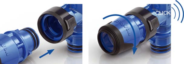 With the new CLICK® house connection system (Figure 1) a range of reliable connection devices has been developed which are easy and time-saving to assemble and which can be put together in the modular system without tools. The vonRoll CLICK® is a bayonet connection which consists of a bayonet socket, a bayonet spigot end and a patented anti-twist device.