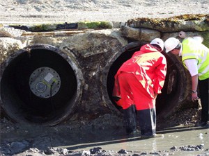 To complete the scheme a 110m wide breach in the shingle bank to had to be excavated to allow inundation of the site. Part of this process was to remove an existing outfall structure whilst maintaining the existing flood defence and so the outfall pipes needed to be closed to prevent seawater entering the site. The contractor called in Stopper Specialists to close the pipes using two of its 700 – 1600mm Trelleborg Mega Plugs. These are large cylindrical inflatable plugs some 2.5m long and up to 1.6m in diameter when inflated.