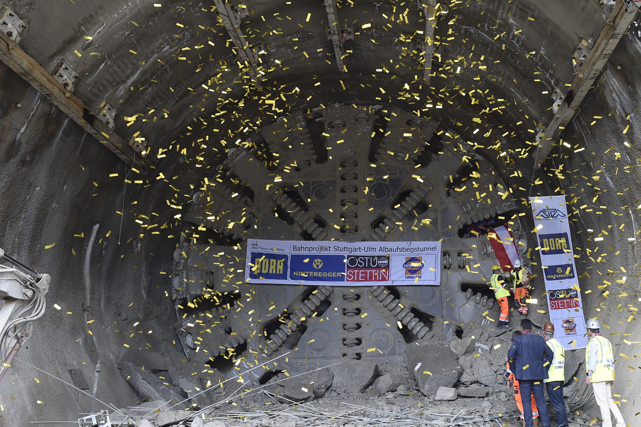 Tunnelling progressed so quickly and safely that the decision was made to use the TBM to excavate further sections of the tunnel that were originally to be built conventionally. In early November 2016 already, after 8.8 kilometers the proud miners of the contracting joint venture ARGE ATA Tunnel Albaufstieg (Porr Deutschland GmbH, G. Hinteregger & Söhne Baugesellschaft mbH, Östu-Stettin Hoch- und Tiefbau GmbH, Swietelsky Baugesellschaft mbH) celebrated their breakthrough in the first, eastern tube.
