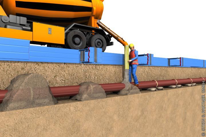 - Prevention of typical installation failures / damage causes which may occur during the conventional installation (e.g. insufficient filling and sealing of the spaces at both sides of the bottom half of the pipe, point bedding of the pipeline, sealing loads that are too high, application of inappropriate materials etc.)