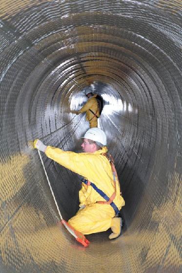 TROLINING liners are available for pipes ranging from 250mm to 2000mm (10” to 80”) I.D.. Segmental lining sheets are offered for rehabilitation of lines greater than 2000mm (80”) I.D. and for elbows and corners in man-sized lines. The rehab system improves the host pipe’s flow characteristics and provides exceeding mechanical and chemical resistance.
