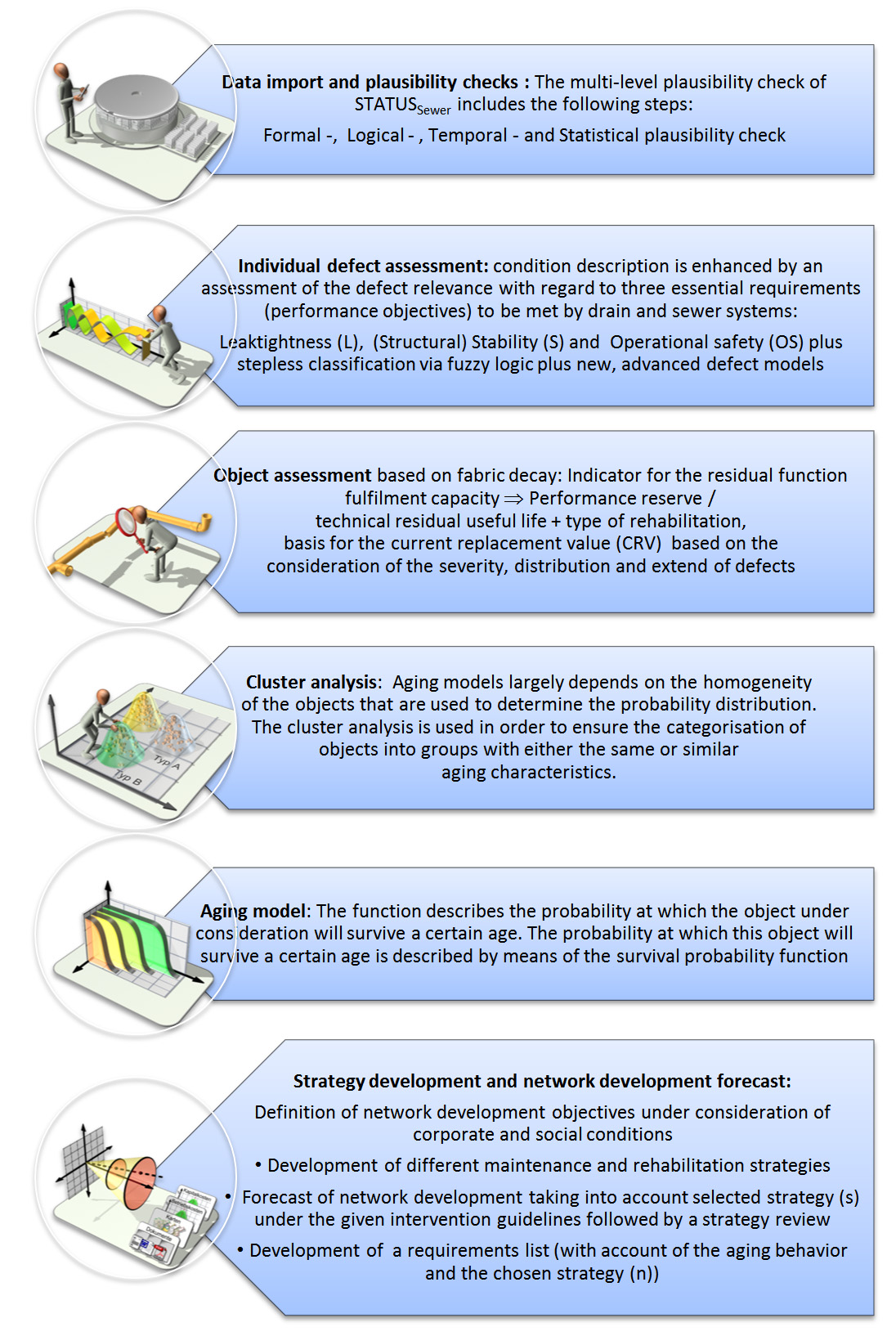 In the following, the strategy development and analyses model STATUSSewer that has been used very successfully in numerous German drain and sewer networks since 2004, will be introduced [13] [14] [15] [16].