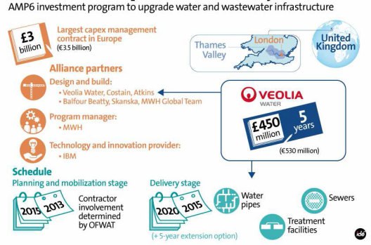 Thames Water, UK's largest water and wastewater services company, has selected a joint venture made up of Veolia Water, Costain and Atkins to deliver a significant proportion of its program of essential upgrades to water and wastewater networks and treatment facilities across London and the Thames Valley. The amount of work for Veolia Water could be worth as much as £450 million (€530 million) for the period 2015 to 2020.