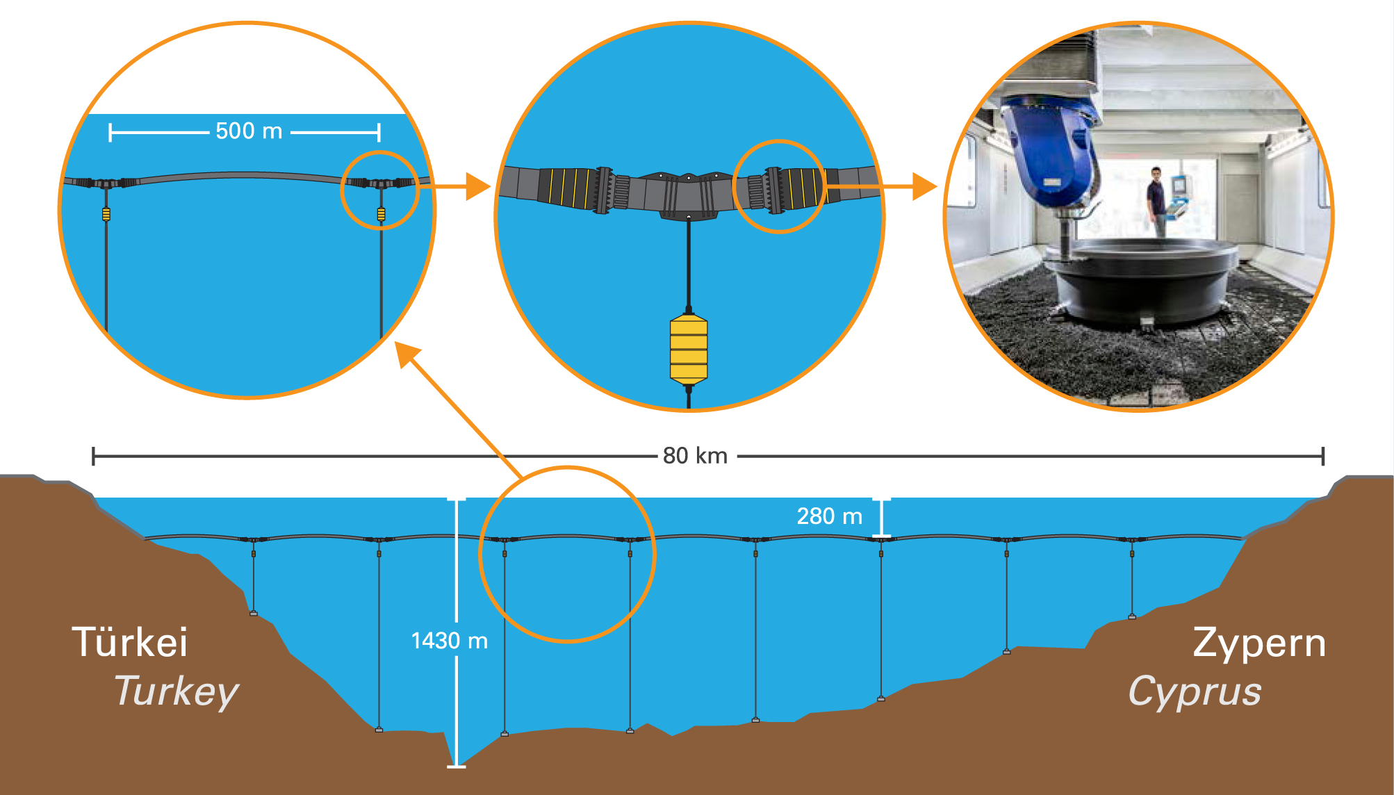 The construction of the 80 km long drinking-water pipeline through the Mediterranean sets new standards in water supply. Urgently needed by the Turkish Republic of Northern Cyprus (TRNC), it runs from the Turkish mainland (Mersin province) to the Turkish part of the island of Cyprus. Single lengths of 500 m PE pipe are being produced for the TRNC project, and installed tethered to float around 250 m below the surface of the Mediterranean. The otherwise customary seabed installation was not the first-choice solution for this project. One of the reasons was the depth exceeding 1,400 m, interspersed with numerous underwater ridges and trenches, encountered along the installation route.