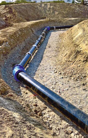 For the development of the new water and extinguishing water supply for the construction area, the competent Luterbach authority decided in favour of ECOPUR type ductile cast iron full protection pipes from the Swiss manufacturer vonRoll. This pipe system has been used for years for the renewal of the water infrastructure in the area. ECOPUR ductile cast iron pipes have an integral interior and exterior coating of polyurethane (PUR), which is classified according to EN 545 [2] as a reinforced coating suitable for use in soils of any level of aggressiveness. With the use of the impermeable cast iron pipe system with integral interior and exterior coating of polyurethane (PUR), the operational security of the water supply to the old industrial location required in the GWP is ensured. The hydraulically smooth polyurethane (PUR) lining with minimal roughness k ≤ 0.01 mm offers the best flow values with a lower pumping effort and energy consumption and so reduces the operating costs for transporting the groundwater.