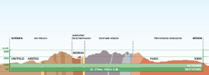 This quick jaunt between the two commercial centers will be made possible by a unique, epoch-making project - the construction of the new Gotthard Base Tunnel along with the Ceneri and Zimmerberg Base Tunnels. With a length of 57 kilometers and a maximum altitude of 550 meters above sea level, i.e. truly at the foot of the St. Gotthard mountain, two single-lane tunnel tubes will cross the Alpine range from valley floor to valley floor, as it were, on an almost level course. This will put an end to travel that was so slow, passengers could almost pick the flowers along the line, and the need for double locomotives to drive freight trains up steep gradients will be a thing of the past.