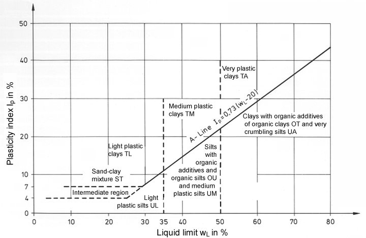 "The German classification standard DIN 18196, which defines and designates soil types according to their particle size distribution and, for cohesive and organogenic soils, refers to the position to the A line, also refers to DIN 4022 Part 1 for a uniform design and description of soil types and rock. The A line is a significant line in the plasticity diagram that classifies clays of a different plasticity and clays/silts with organic admixtures, in the illustration of the liquid limit wl compared to the plasticity index Ip" (http://www.geodz.com/deu/d/Klassifizierung_von_Boden_und_Fels)