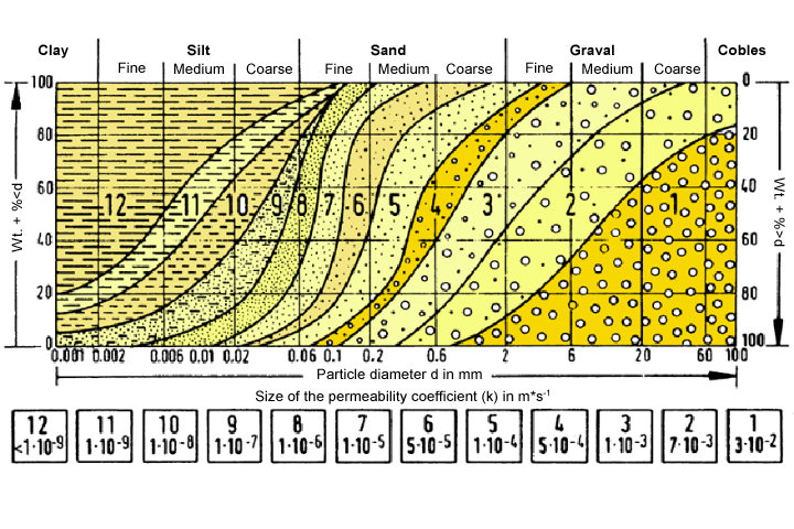 Permeability coefficients k for various soil types [Graßh82]