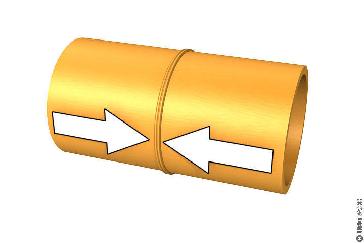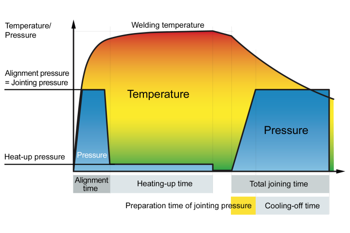 The areas to be welded are supposed to connect with a velocity of near zero. The necessary jointing pressure is preferably applied in linear increase and is, for instance, 0.15 ± 0.01 N/mm2 for PE. Sudden use of full pressure would press the hot plastic material out of the welding zone which would result in an inadequate weld factor [Simona11]. The jointing pressure has to be maintained during the cooling-off period. |