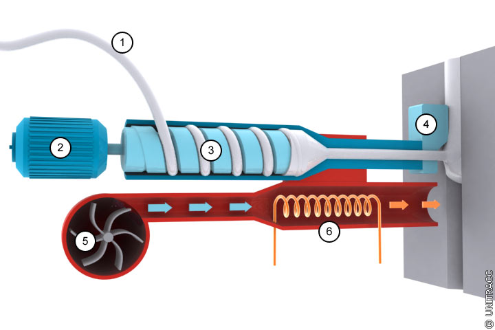 The extruded and plastified welding additive (extrudate) leaks as a line from a plastifying unit.