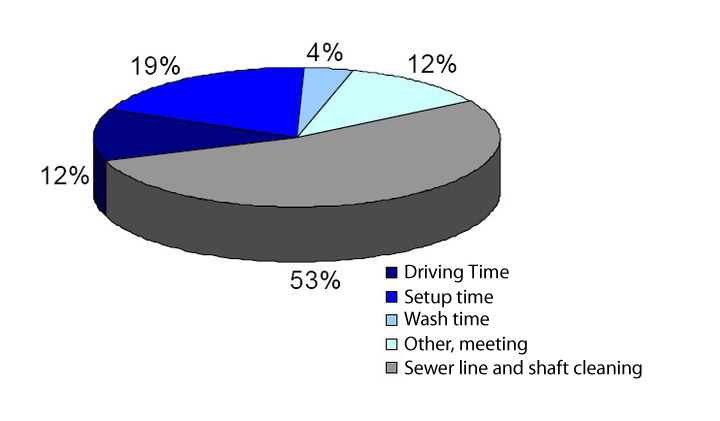 Research from the Ruhr University in Bochum, Germany concerning this matter showed that only about half of the estimated working time was available for the cleaning of sections and shafts on site. One third of the working time was used for tooling and traveling. Especially in the case of cleaning vehicles without a water recovery tank the refilling of the flushing water took up a high share of the tooling time. Approximately 12 % of the working time was used for traveling between cleaning locations and the depot [Orth2008].