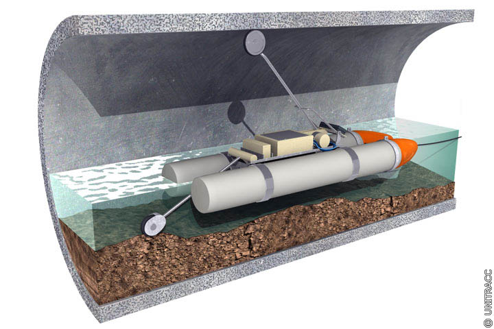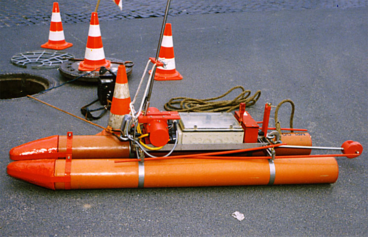 The sewer measuring boat can be used in sewers from DN 700 (28'') to DN 2000 (80''). It floats on the wastewater and uses sensors to measure the height of the wastewater and the settled deposits in the pipe. The stored sensor data is later processed to obtain a precise determination of the deposit situation within the sewer line.