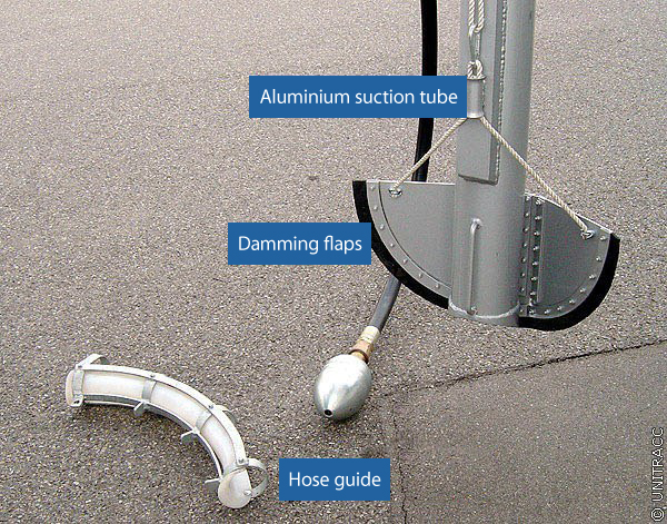 Aluminum suction tubes can include additional air vents used to maintain the air volume during deep applications. The damming flaps are used in combination with water reclamation technology to increase the water volume at the suction tube intake, particularly in low flow sewers. The hose guide is used to protect and guide the hose around corners and sharp edges.