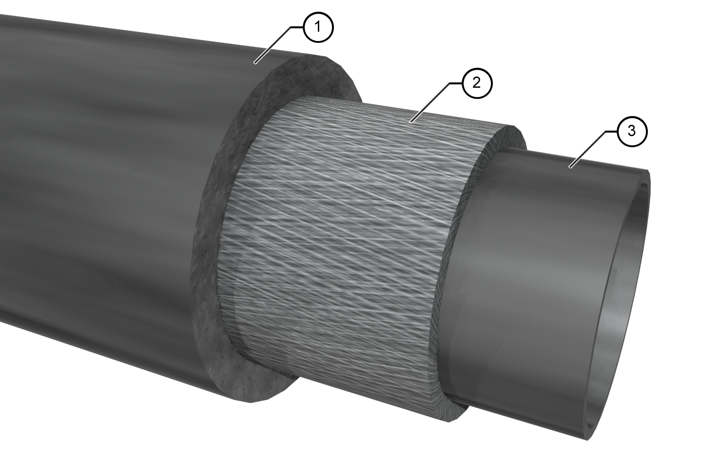For rubber hoses, the pressure reinforcement (2) is composed of textile and steel wire mesh, whereas, for plastic hoses, it is made of polyester and polyamide mesh. Newer high-pressure flushing hoses are generally equipped with fabric inserts of single- or multi-layer plastic fibers. Hoses with steel wire mesh are only used in case of higher operational pressures for special applications in industry. Due to their greater overall weight, they are rarely used in sewer cleaning.
