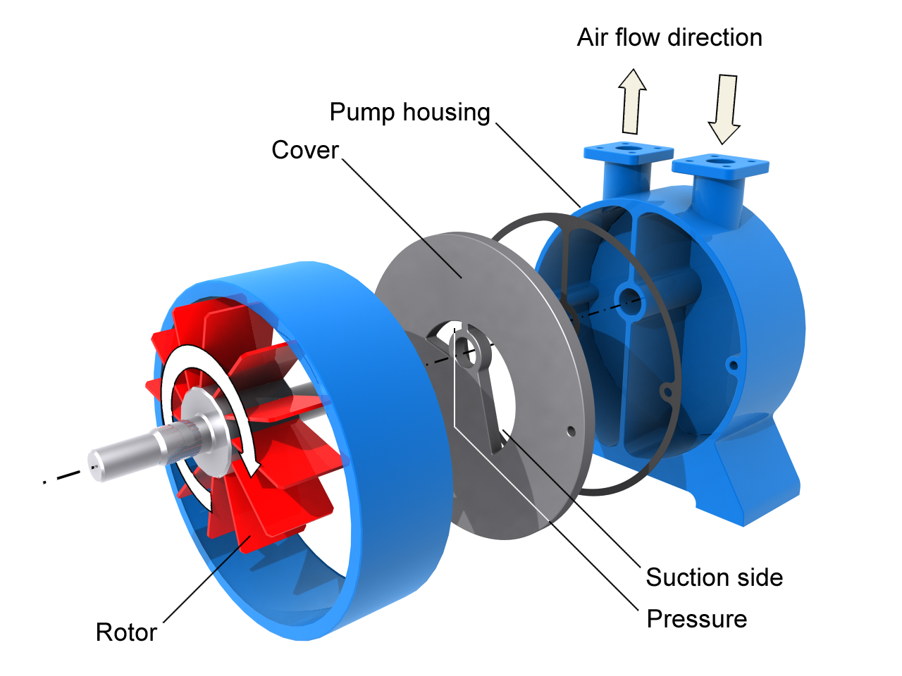Most commonly used vacuum pumps include the liquid ring pump and the rotary vane pump. In comparison, the rotary vane pump exhibits poorer performance and has a higher wear factor as a result of the mechanical contact between internal components, which require lubrication. Due to noise emission, acoustic insulation is also indispensable. Advantages of rotary vane pumps include their modest purchase price and low tare weight.