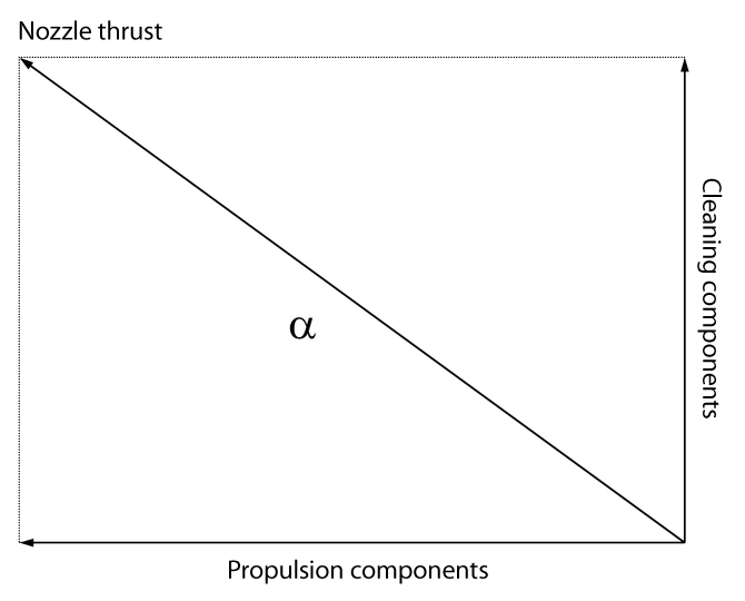 From a mathematical point of view, the force of the nozzle jets can be split vectorially into cleaning and pulling force components (drive force), meaning that the energy distribution for these two reactions changes depending on the jet angle.