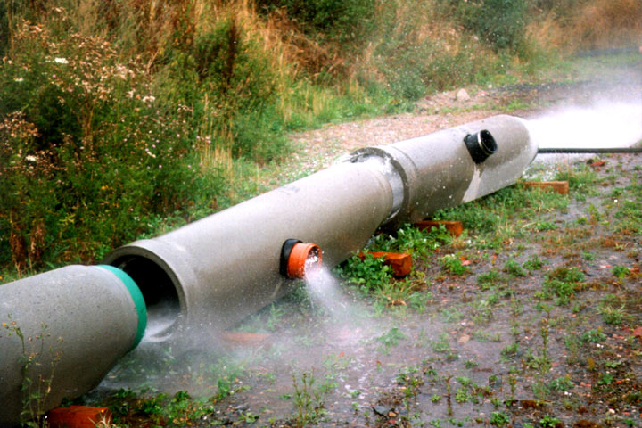 The test is carried out on sewage pipes size DN 300 (12''), to which lateral connections are installed by the manufacturer or distributor at the spring line (or rather between the spring line and the crown). A standard cleaning vehicle with a maximum water pressure of 210 bar is used in the flushing tests. The cleaning nozzle which is used has 10 nozzle apertures with individual diameters of 2 mm and a jet angle of 45°. Water is supplied via a high-pressure hose with a length of 120 m and a 25 mm diameter.