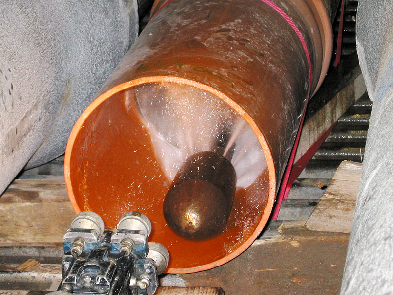 To simulate long-term stresses, the cleaning nozzle is pulled through the respective pipe for a total of 50 times at a constant flushing pressure of 150 bar (measured at the high-pressure pump) and a velocity of about 4 m/min. Afterwards, the inlet of the service pipe is visually inspected and quantitatively checked through leak-tightness testing.