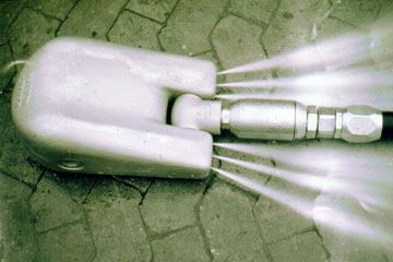 Attaching a vertically pivoting joint along with increasing its overall weight minimize the flat nozzles tendency to hydroplane. Its firm positioning in the channel and wedge shape design prevent the nozzle from getting jammed and ensure a sufficient cleaning of the pipe invert. Additional front facing jetting nozzles can be used to increase the cleaning performance and improve the forward progress by reducing friction.