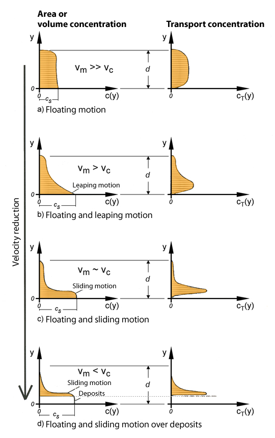 Concentration profiles of solids in the flow cross-section as a function of the average flow velocity [Führb62]