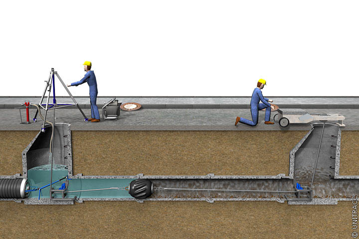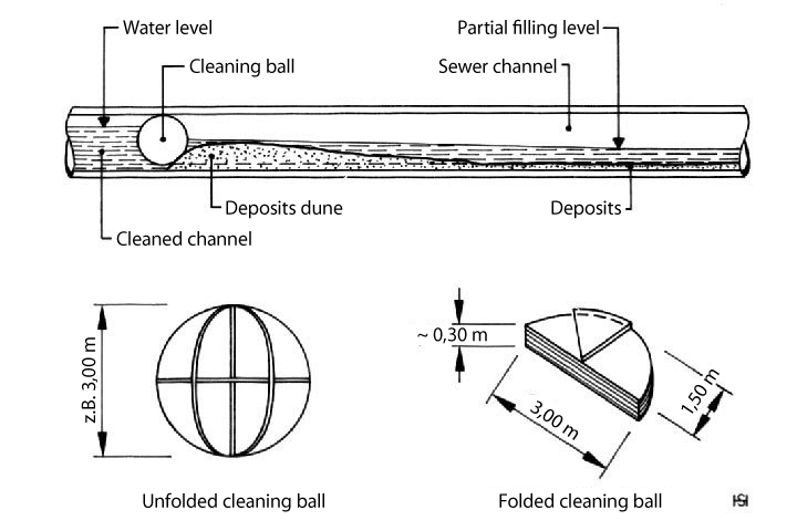 Cleaning balls have either a solid or foldable construction which can be pulled through the sewer using a cable guide or pushed through by the sewer currant.