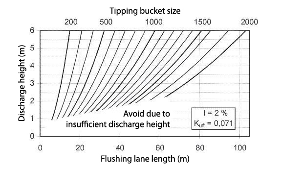Design diagram for the dimensioning of a tipping bucket with a flushing lane gradient of 2 % [FI-UFT]