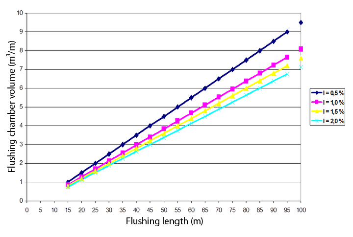 Required flushing chamber volume [m³/m] for the cleaning procedure of stormwater tanks depending on the flushing length and the invert gradient [FI-HST]