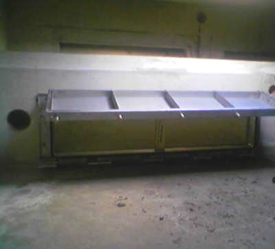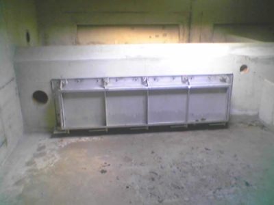In the case of the flushing chamber with a flush gate, the lower opening of the flushing chamber is closed by means of a flush gate. The filling of the chamber depends on how the sewage flow is guided and can, for example, be implemented by arranging a restrictor or via check flap gates in the chamber walls. Depending on the operation mode and the system type, the opening of the gate is triggered either by a water level measurement (with auxiliary energy) or a floating gauge (without auxiliary energy) [Dettm2005a].