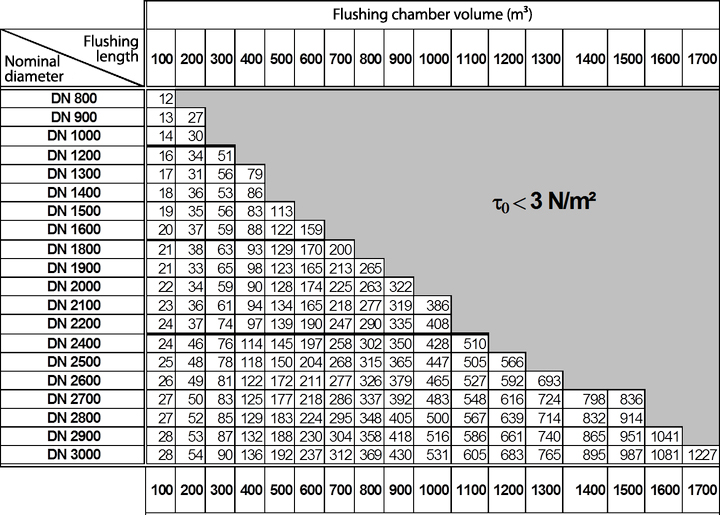 According to [Dettm2005a], the design tables apply to surge flushing by means of sewer volume activated flushing systems in man-accessible sewers with circular profiles. Preventive cleaning is based on a critical erosion shear stress of τe, krit = 3 N/m² , thorough cleaning on τe, krit = 5 N/m². These design tables are not applicable for the removal of solidified or strongly cohesive deposits. These cases require substantially larger flushing water volumes and surge levels. In individual cases a thorough cleaning using high pressure cleaning might be required.