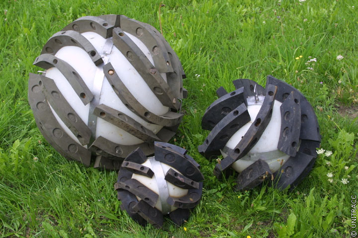 This method comprises the transport of spherical devices with structured surfaces through drainage channels for the sole purpose of deposit removal [DIN EN 14654-1].