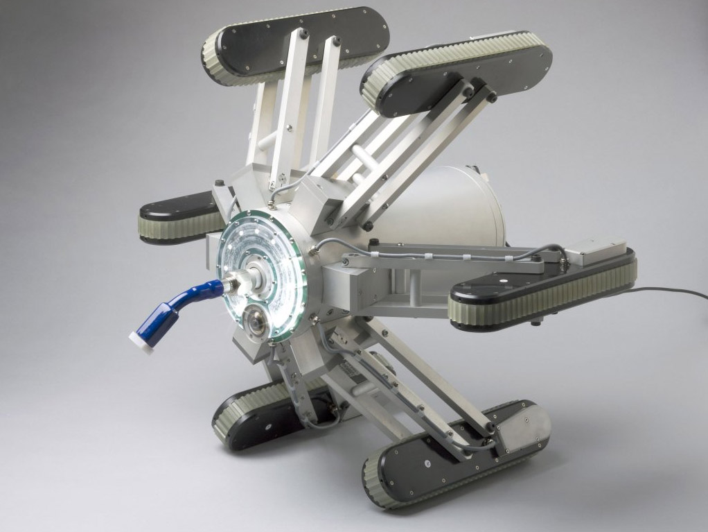 The remote-controlled robot is equipped with an extendable six- track-driven chassis, which keeps the unit centered in the duct. The cleaning performance is supervised via an integrated camera and illumination unit. The dry ice and air mixture is blasted against the duct walls through a nozzle attached at the front of the unit.