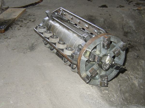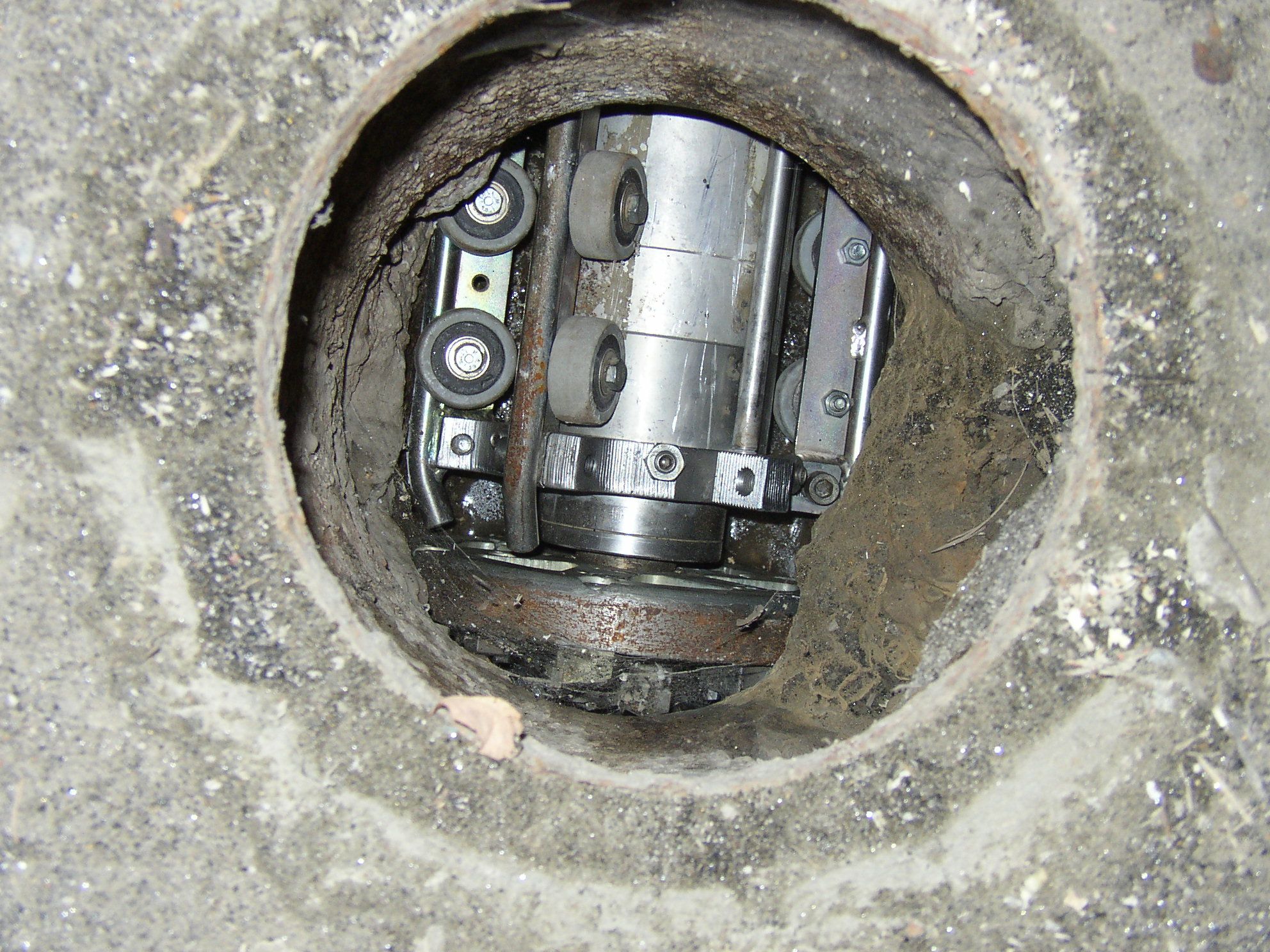 The device is propelled through the sewer line using high pressure water jets emitted from nozzles at the tail end of the impact borer. In this process, the pipe wall is cleaned and the already loosened deposits are flushed away. The milling head is operated hydraulically in both the rotating and impact motions. Depending on the operating pressure, it impacts the deposits with 1,000 to 1,500 blows per minute, while milling at the same time at 100 to 200 rpm. The pressurized water used for the milling and hammering action is then used to clean the tool.