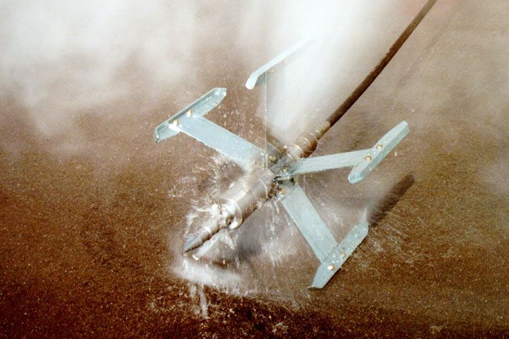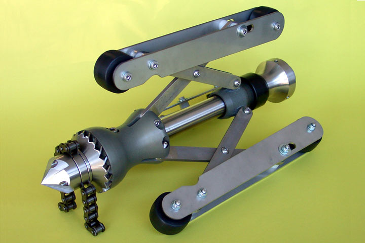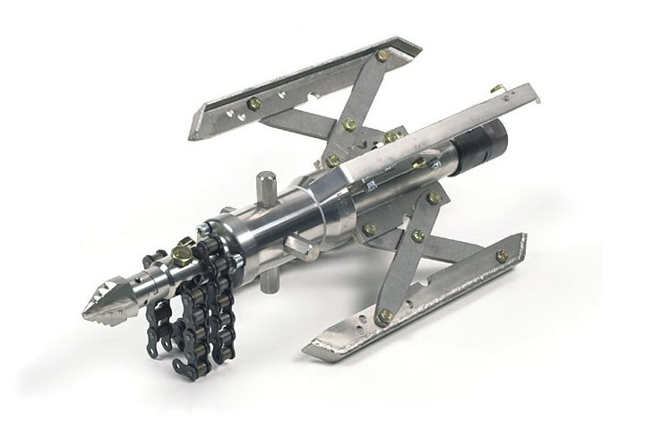 Rotary chain cutters are composed of a guide sled with three or more skids and a rotating head with steel chains. The rotating head can either be driven hydraulically using high pressure water or via an electric motor. The device installed on the guide sled is pulled through the section using a cable winch. The skids ensure the stability of the rotary chain cutter during its operation in the sewer. The steel chains installed on the rotating head cut off protruding roots and incrustations.