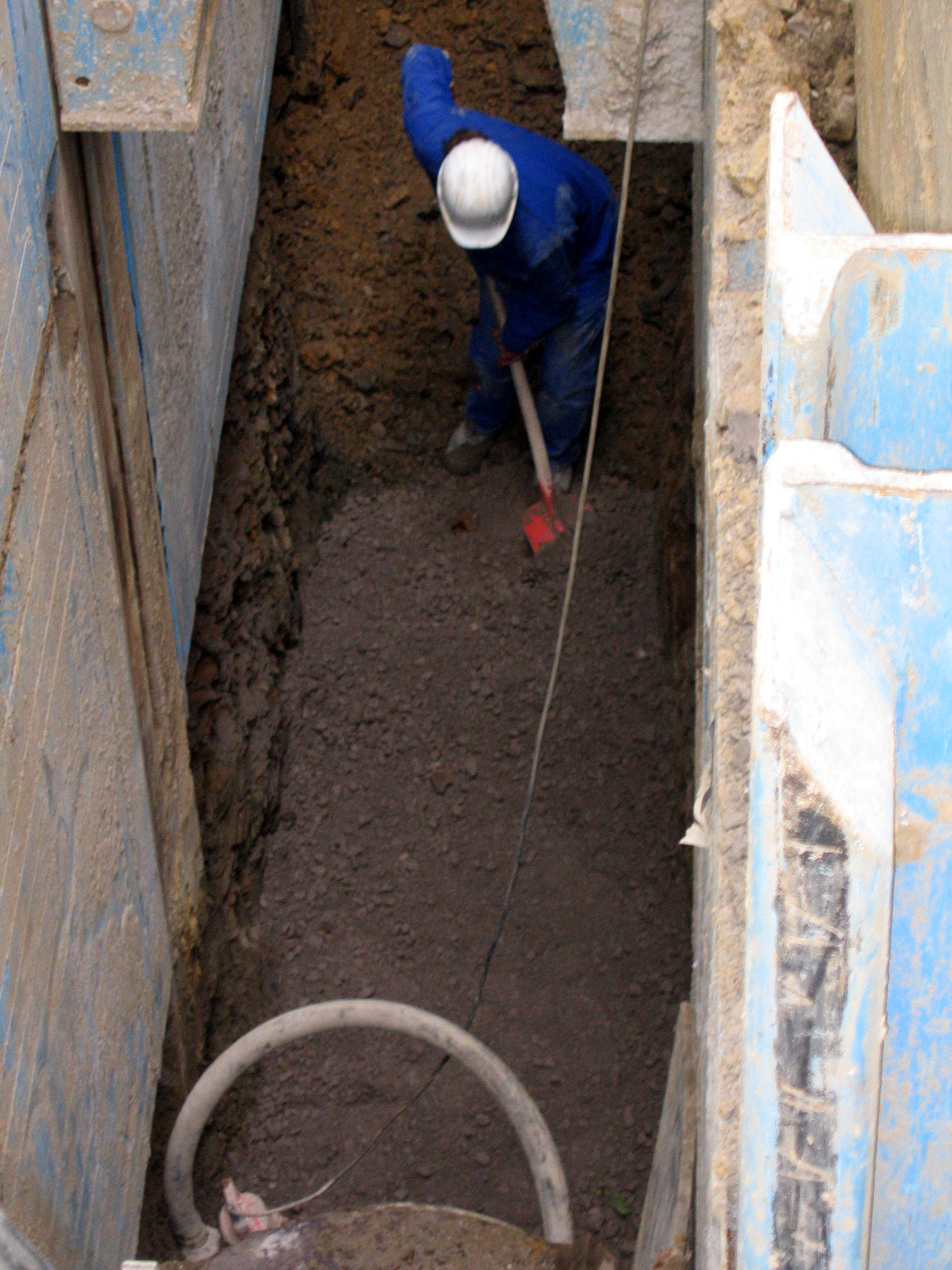 Das Material zur Herstellung der unteren Bettungsschicht, d. h. des Rohrauflagers (z. B. Schotter der Körnung 0/45), wird in den Graben eingebracht und zunächst manuell grob verteilt. |