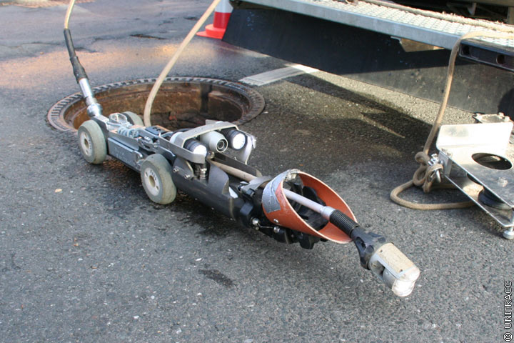 Spülkameras stellen ein kombiniertes Reinigungs- und Inspektionssystem dar (Image 11.2-4). Die Kamera ist am Ende eines Hochdruckschlauches befestigt und wird über Hochdruckwasserstrahlen vorgetrieben. Der hydraulische Antrieb lässt das System nicht nur reibungsarm über Versätze und Bögen gleiten, sondern er reinigt die Leitung zugleich.