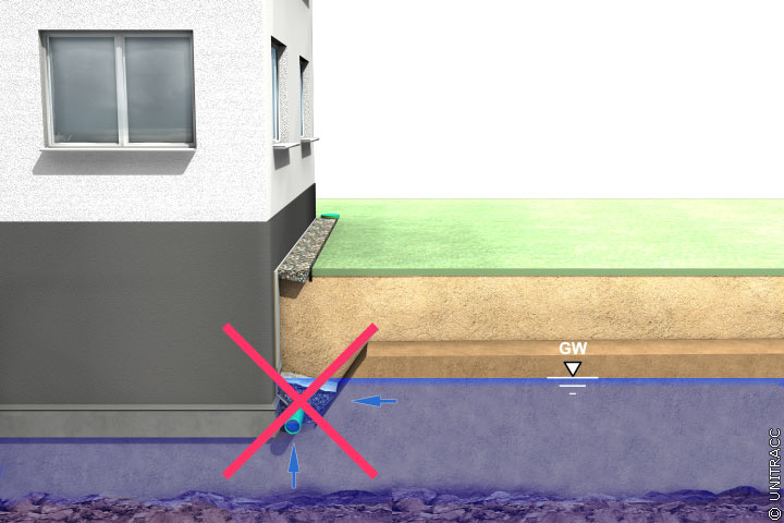 Dränageanschluss - nicht erlaubt, wenn der Keller im Bereich eines Grundwasserleiters liegt [Quelle: STEIN Ingenieure GmbH] |
