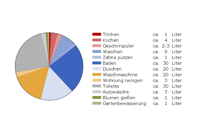 In der Regel wird der Wasserbedarf eines Haushaltes durch Trinkwasser aus dem öffentlichen Netz gedeckt. Man kann davon ausgehen, dass nahezu die gesamte Trinkwassermenge nach Gebrauch als Schmutzwasser in den Kanal eingeleitet wird. In Deutschland werden pro Person und Tag durchschnittlich 126 Liter verbraucht (Image 1-2).