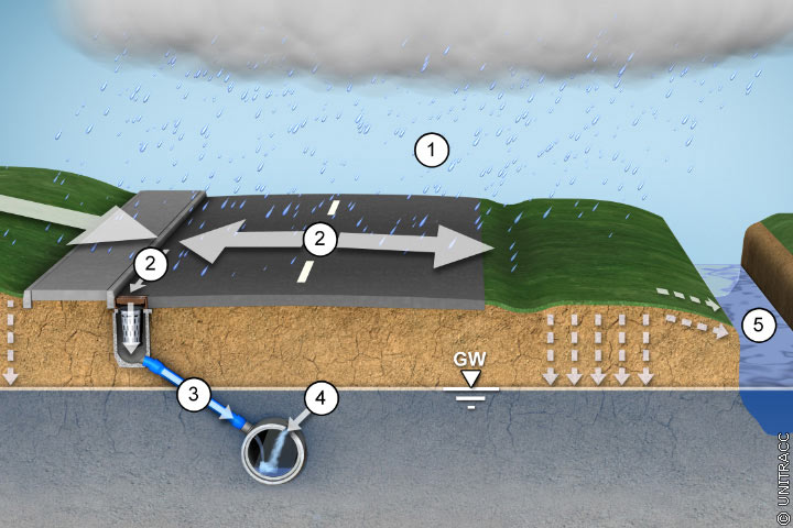 Letzerer ist der Niederschlag, der nicht im Boden versickert ist und von Bodenoberflächen (Wegen oder Garageneinfahrten) oder von Gebäudeaußenflächen (Dachflächen) in das Entwässerungssystem eingeleitet wird (Image 1-1)