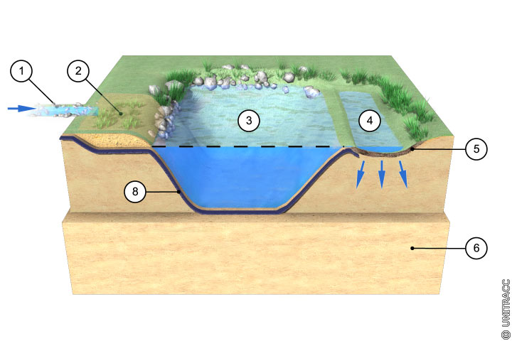 Funktionsbeschreibung: Regenwasser wird oberflächig einem Teich mit Überlauf zur Versickerung zugeleitet und dort zwischengespeichert
