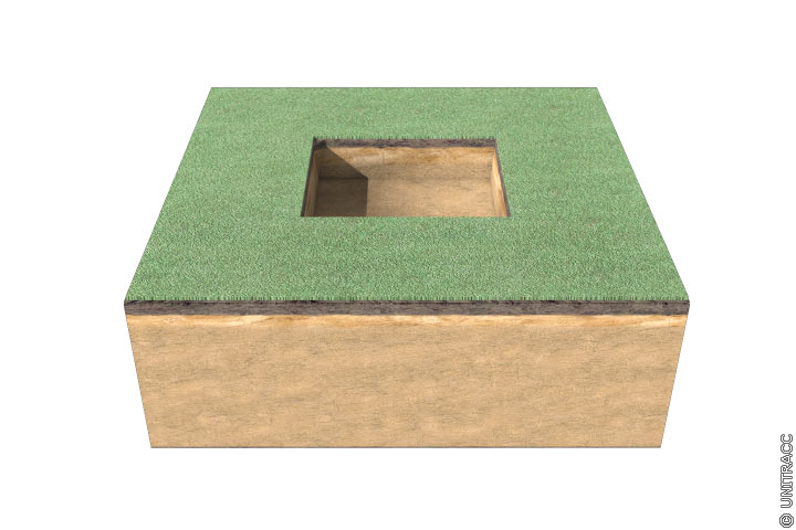 In der gewählten Tiefenlage wird ein Loch (Image 16.5-1) gegraben mit einer Fläche von ca. 50 cm x 50 cm und einer Tiefe von 20 cm unterhalb der Mutterbodenschicht, die i.d.R. ca. 20 cm bis 30 cm stark ist.