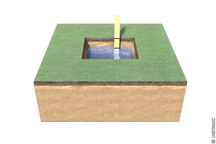 Anschließend wird die Grube bis zur Unterkante der Mutterbodenschicht mit Wasser gefüllt und die Wasserhöhe mit Klebeband am Zollstock markiert (Image 16.5-2).